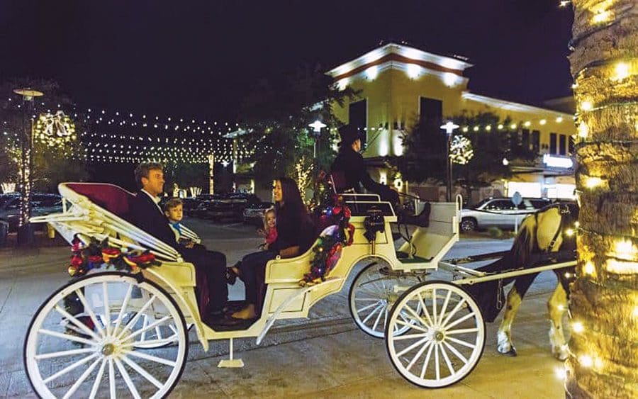 Enjoy free horse-drawn carriage rides around the Town Center while taking in the Coastal White Christmas lights and the Festival of Trees display. To add to the festivities, get a complementary professional photo with Santa while listening to the seasonal sounds of the Emerald Coast Theatre Company’s Dickensian Carolers singing popular holiday carols.