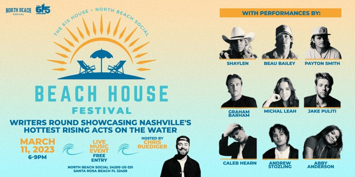 North Beach Social and The 615 House have teamed up once again to bring Nashville country fire to South Walton, Florida, with a special songwriters concert on Saturday, March 11, 2022. Featuring a stacked lineup of up-and-coming artists, the free event is open to the public.